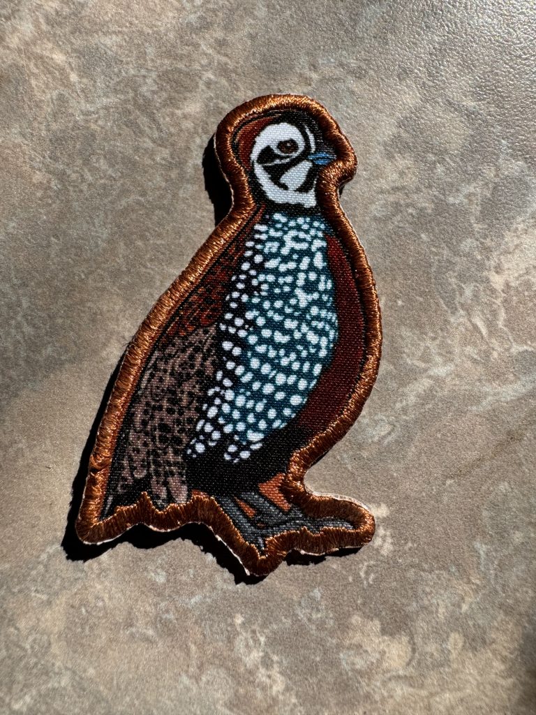2.5″ Iron on patch of the border bandit Mearns’ quail.  The most elusive quail in Arizona can now be on your ammo bag, bird vest, hat…or anywhere you can iron it on something.  45 sec with a hot iron and terry cloth to protect the patch while applying it will set the glued backing.  Have fun!