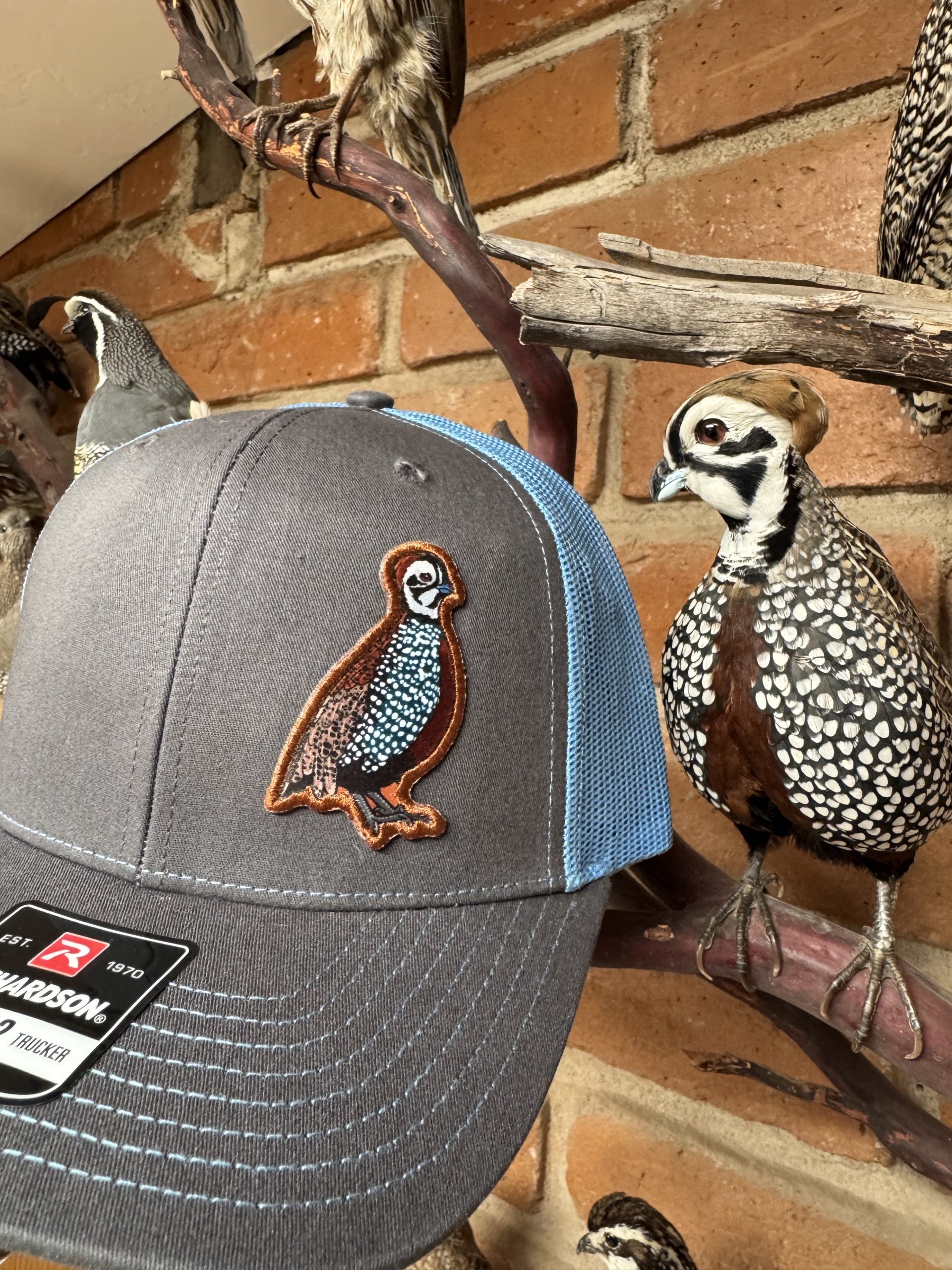 Mearns quail trucker hat. Mearns patch heat pressed on to a Richardson 112 trucker hat.